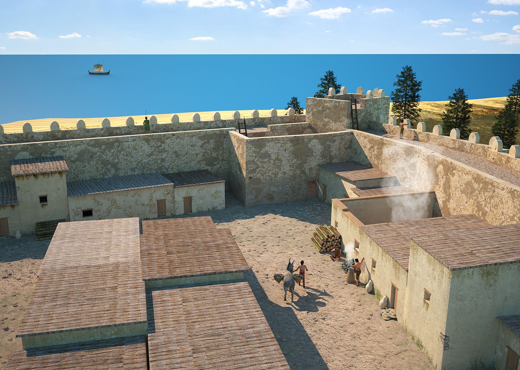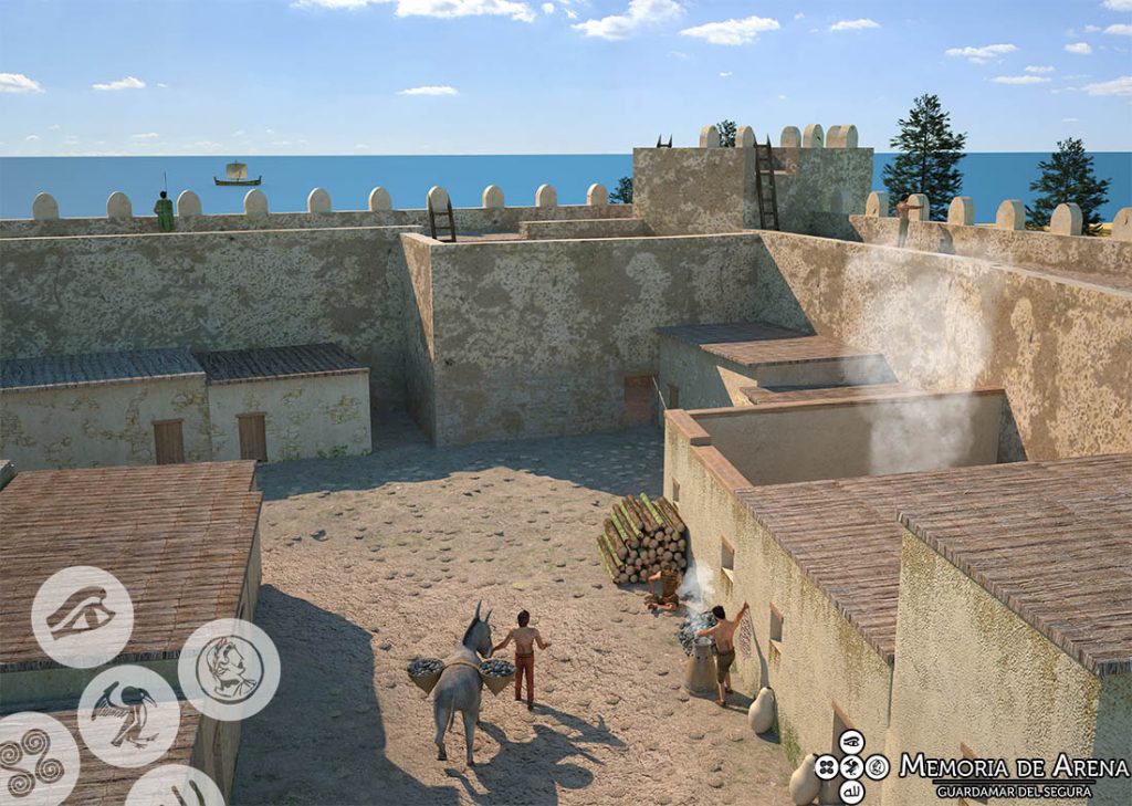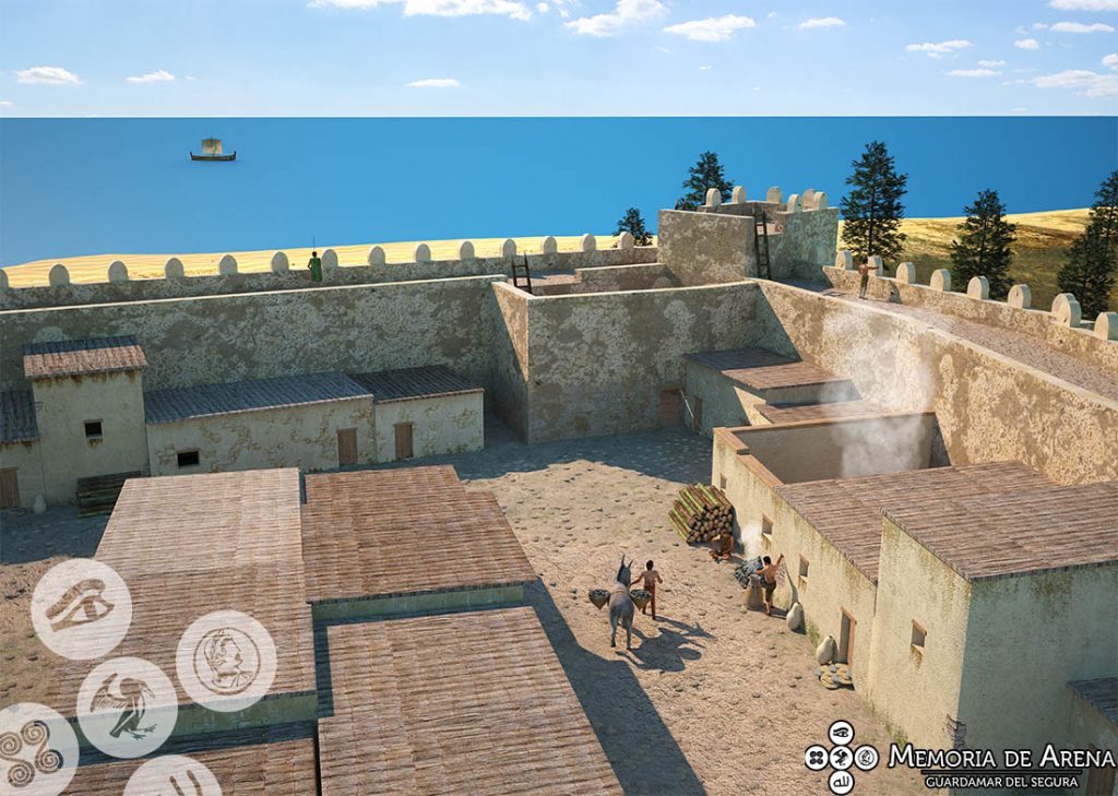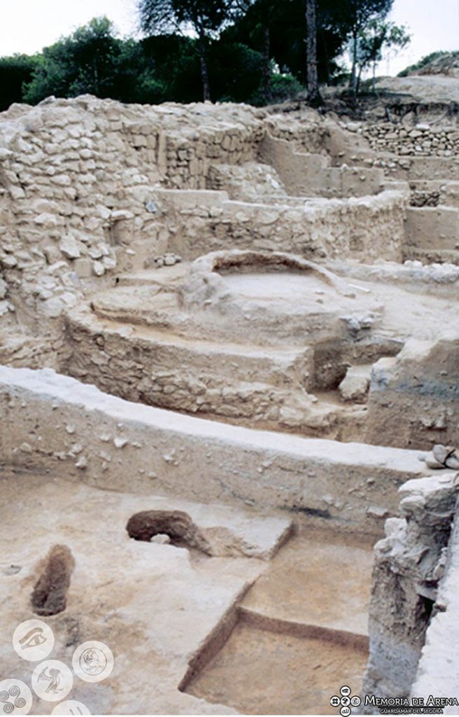 El primer elemento que no existía en la antigüedad era toda la arena que nos rodea y por supuesto, los pinos que se plantaron a principios del siglo XX bajo la dirección de Francisco Mira. Con lo cual, la línea de costa estaba mucho más cerca de las murallas de La Fonteta; tras ellas tan solo una franja de costa de no más de 100 metros hasta llegar al mar.